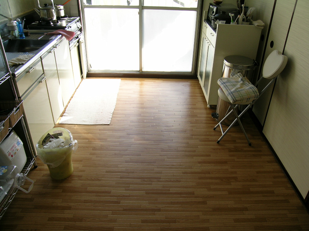 ウッドカーペットでプチリフォーム」に続き、キッチンの床もプチリフォームしました。元々のキッチンの床は、本当に薄いビニールが敷いてあるだけで凸凹が気になるだけでなく、デザイン的にも気に入らなかったので、ちょっと厚めのビニール製のフローリングマット切り売りタイプをホームセンターで買ってきて上から敷いてみました。