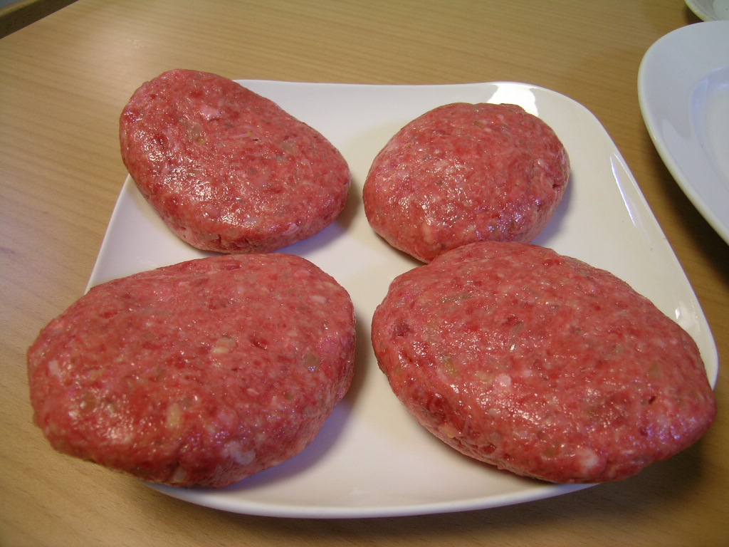 - ボウルに挽肉、塩、胡椒、ナツメグを入れて2〜3分ほど良くこねる。その後、玉ねぎとパン粉を混ぜて更に5分ほど良くこねる。良くこねることで肉汁の流出が防げます。