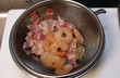 - 残り3分になったらオリーブオイルと大きめに切ったにんにくを弱火〜中火で炒めます。にんにくに色が付き始めたらベーコンと海鮮類を中火で炒めます。にんにくは炒め終わったら取り除いておいてもOKです。所詮風味づけなんで。