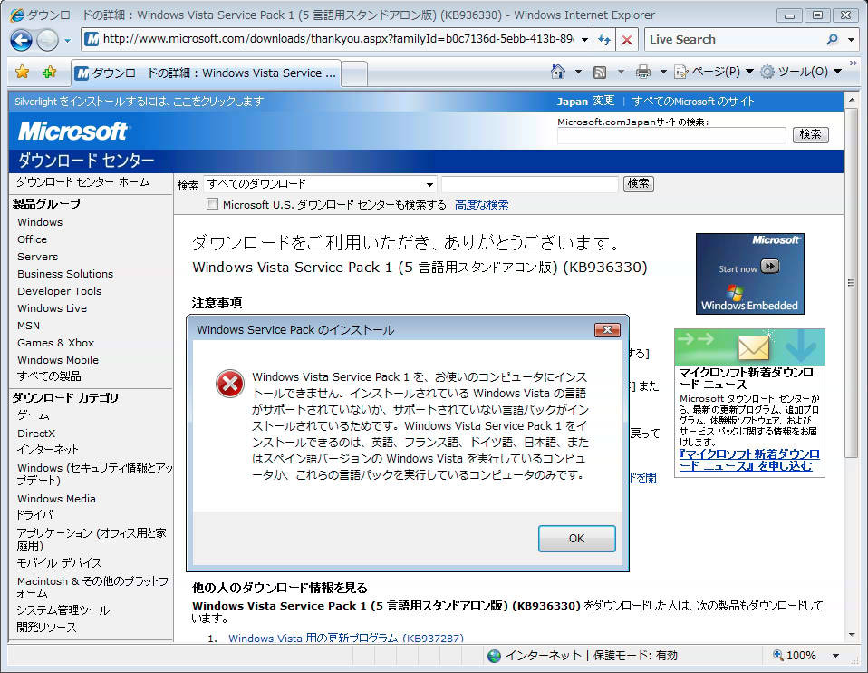 Windows Vista SP1 は主要5カ国言語パック以外が入っているとインストールできない