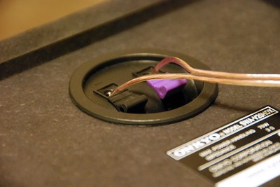 次にスピーカーと AV センターをケーブルで接続します。ケーブルは種類によって本当に音質が変わる重要な部分と経験上感じています。同梱されているケーブルは残念ながら 1mm 程度の細い一般的な銅線ケーブル。結構貧弱です。ピュアオーディオ以外のパッケージ製品ほぼ全てに対して言えるのですが、ケーブルをもうちょっと良くするだけで音質が向上するはず!もうちょこっとケーブルには拘って欲しいなぁ〜と思います。