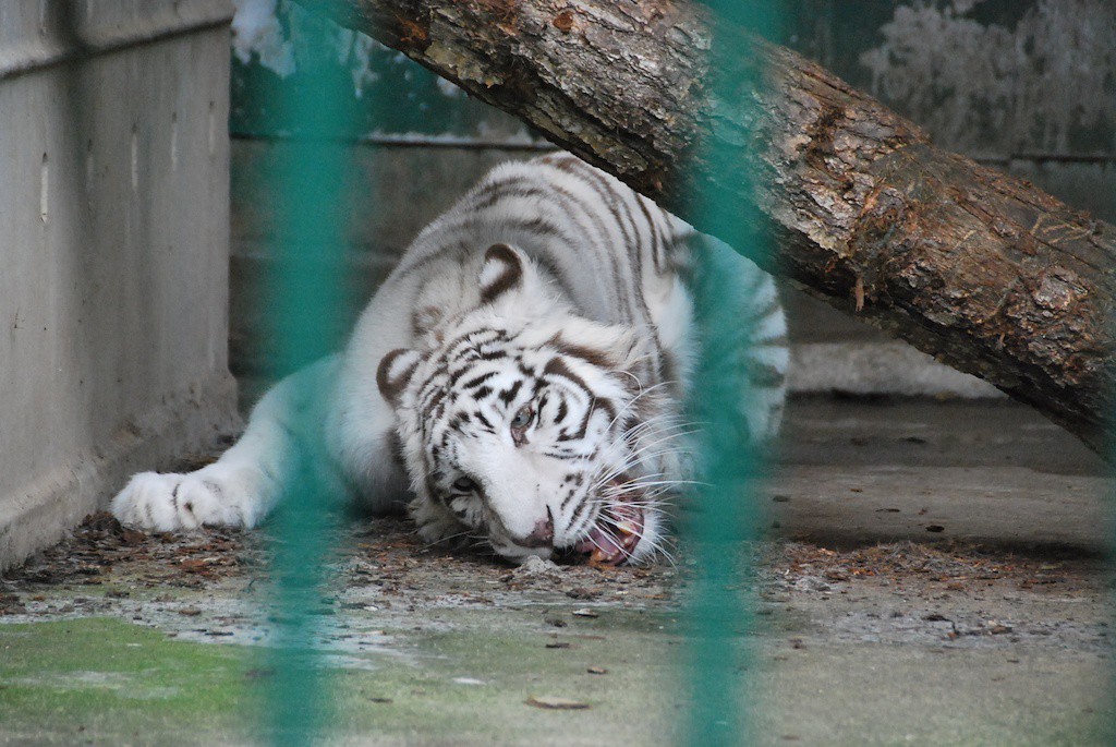お隣にホワイトタイガーもいます。やっぱり白さが違います。ホワイトって言うんだったらこうじゃないと!って思わせてくれる白さです。でも機嫌が悪いのか檻の奥の方で寝そべっていて前に出てきてくれませんでした。残念。 (´・ω・`)ショボーン。