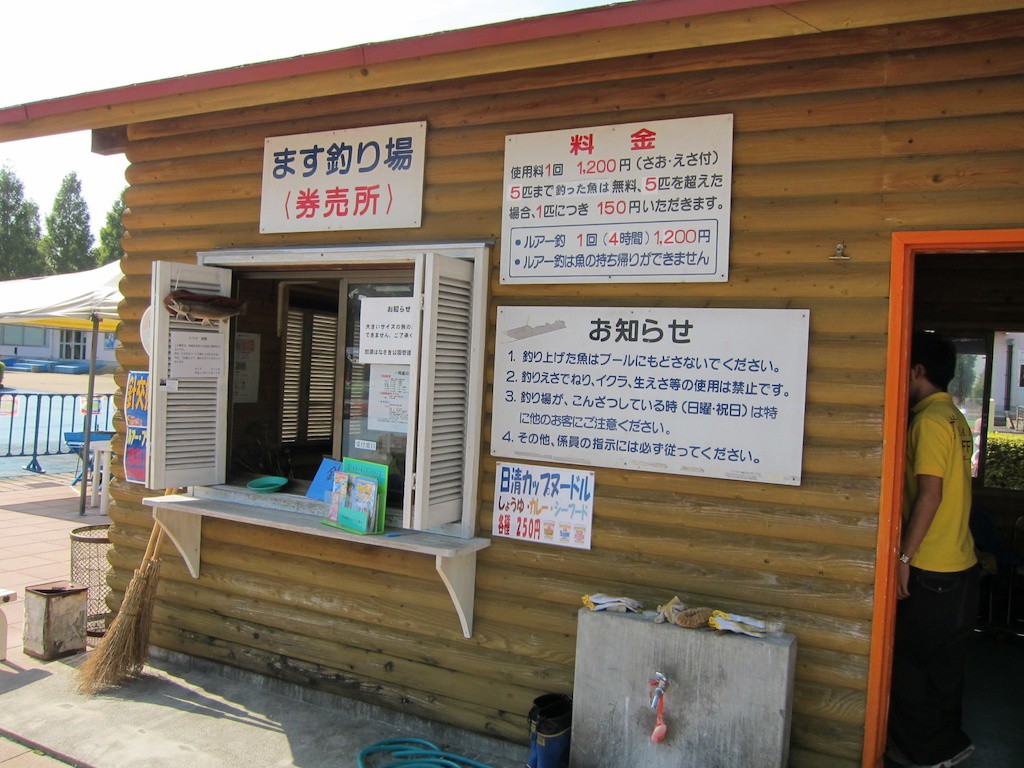というわけで今日の目的はニジマス釣りと、補助なしの自転車の練習なんですが、まずはマス釣りです。1,200 円で5匹まで無料で持って帰ることができます。6匹目からは@150です。ちょっと高めの値段設定ですね。