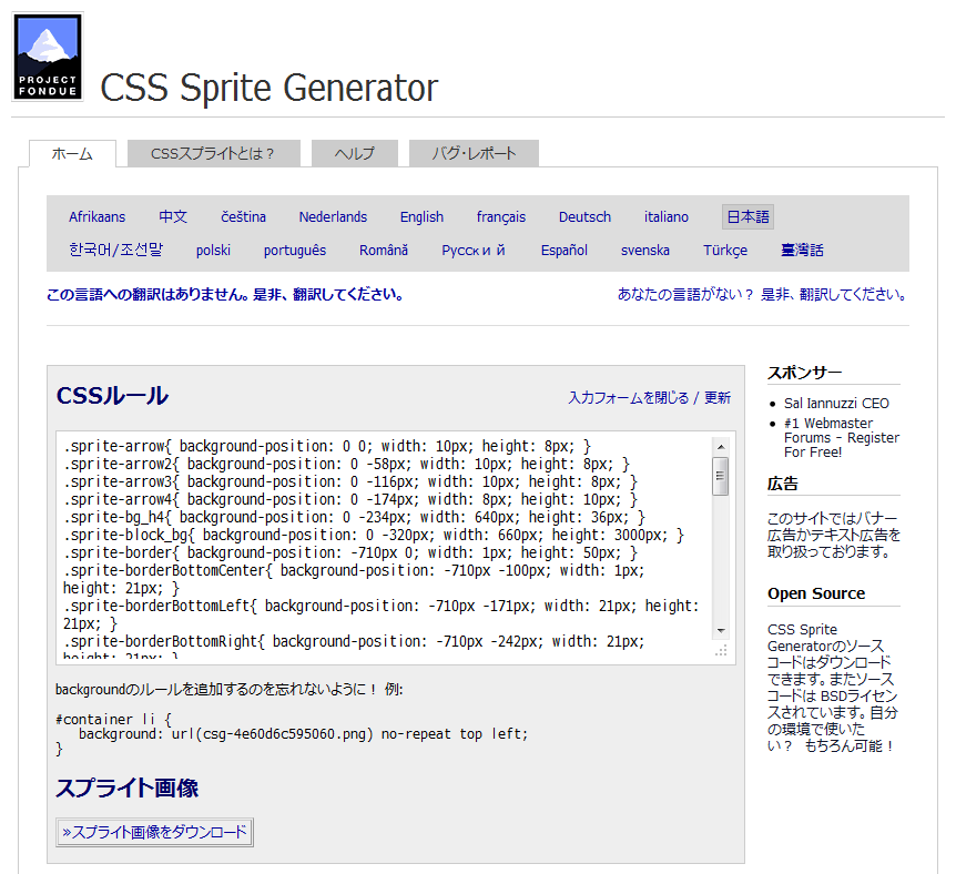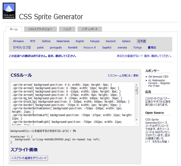 次に実施したのは css スプライトによる http リクエスト数を減らすことです。CSS Sprite Generator というサイトを利用して css で使っている画像や html 内に直接記述していたアイコン類をまとめて1つの画像に合成して css sprite 化します。基本的に repeat 指定がある画像以外は css sprite を使って置き換えが可能です。