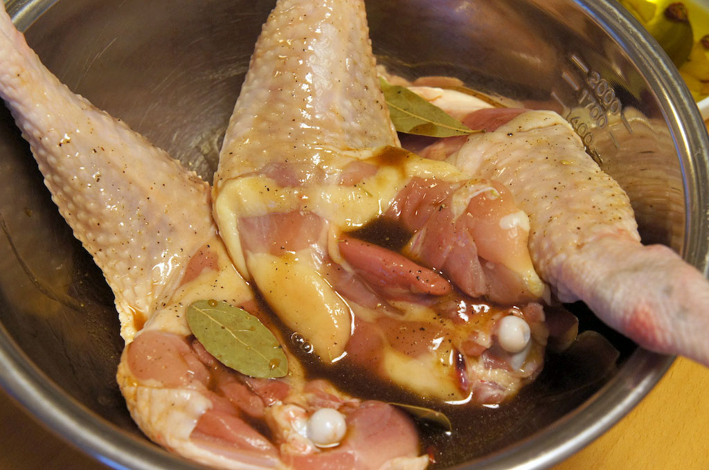 まずはバルサミコ酢と蜂蜜ベースの秘伝のたれでじっくり1時間ほど肉に下味をつけます。