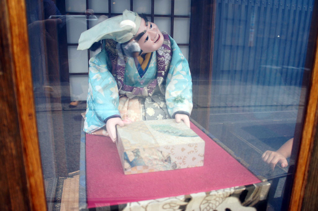 古い町並みにあるからくり人形。溝の上に設置されており、溝を流れる水の力を水車で動力に変え半永久的に動き続けるそうです。飛騨高山はからくり人形も有名だとか。