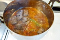 - 完熟トマトとウスターソースを加えトマトに十分火を通したら、肉を戻し、水と赤ワインを加えてひと煮立ちさせる。
