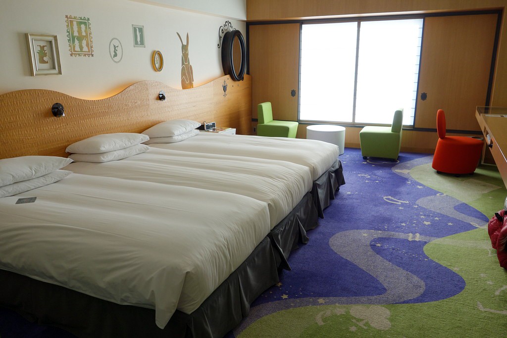 14:30ほどに一旦ディズニーランドを後にして、ヒルトンホテルへと向かいました。15:00前だけどチェックインさせてもらえました。ハッピーマジックルームは内装は子供っぽいですがベットが3つあるのでお気に入りの部屋です。