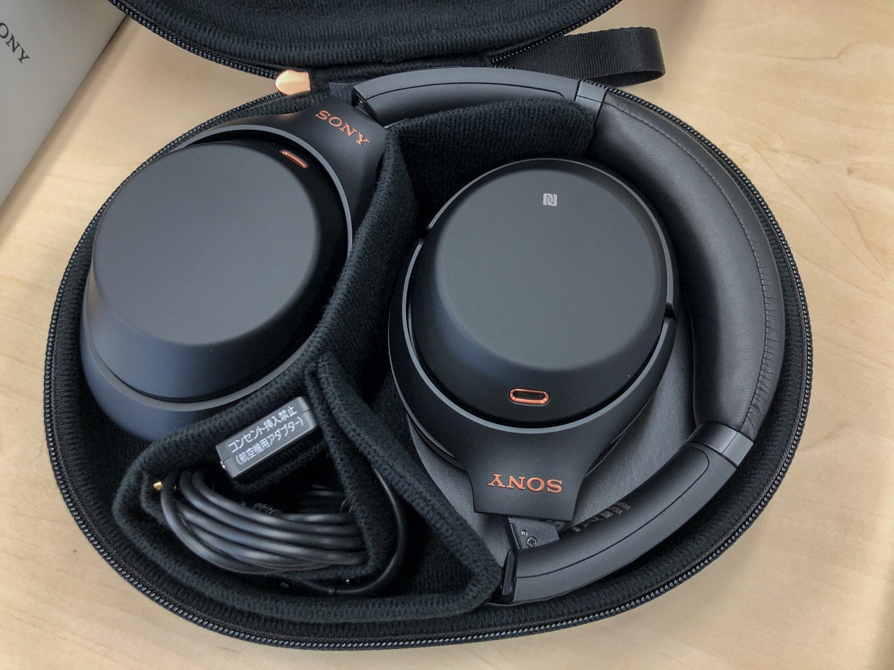 こちら SONY の WH-1000XM3 になります。付属のヘッドホンケースにはこのような形で折りたたんで収納します。