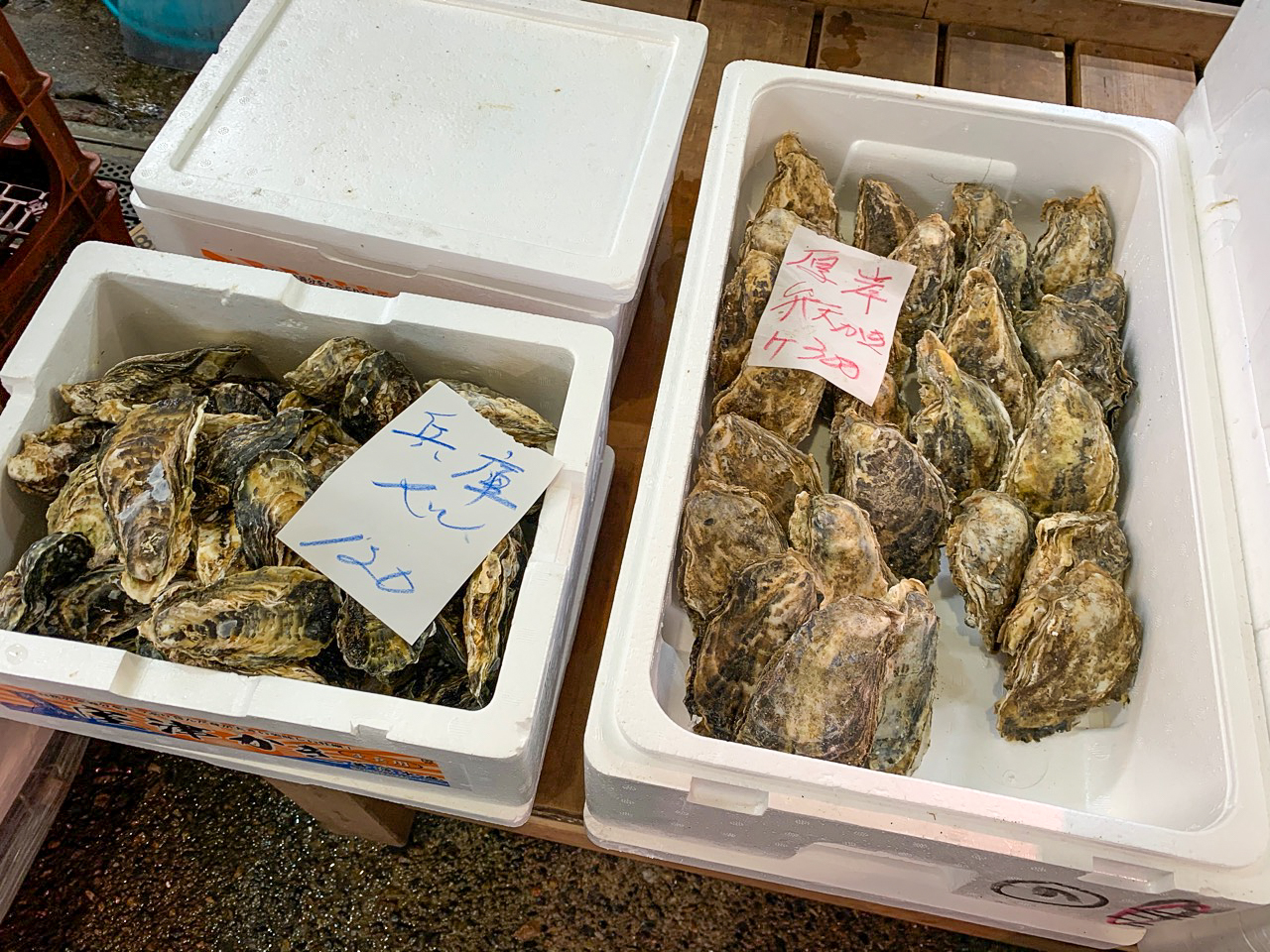 生牡蠣。数年前にスーパーで買った殻付き牡蠣にあたって大変な思いをして以来生牡蠣は一切口にすることがなくなりましたが、今日の夕飯が用意されていなければ絶対買ってた。この右のやつ、めちゃ美味しそうな牡蠣だ。