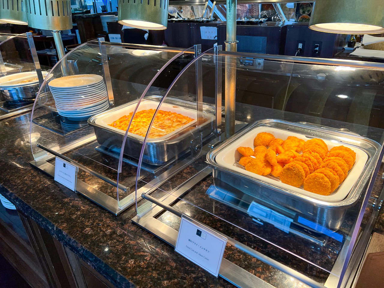 本日のフライはメンチカツだった。揚げ物を食って一気に満腹感がきて、腹 9 分目くらいに到達。ローストビーフのおかわりとスイーツを天秤にかけ、スイーツに行くことにした。